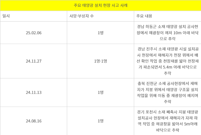 19일 한국산업안전보건공단 산업안전포털의 사고사망속보에 따르면 지난해부터 이날까지 총 9건의 태양광 설비 공사 중 사망사고가 발생했다. 9건 모두 건물이나 축사 지붕에서 태양광 설치하는 과정에서 추락해 발생했다. 특히 지붕에 설치된 유리인 채광창이 깨져 발생한 사망사고가 6건이나 되는 것으로 나타났다.