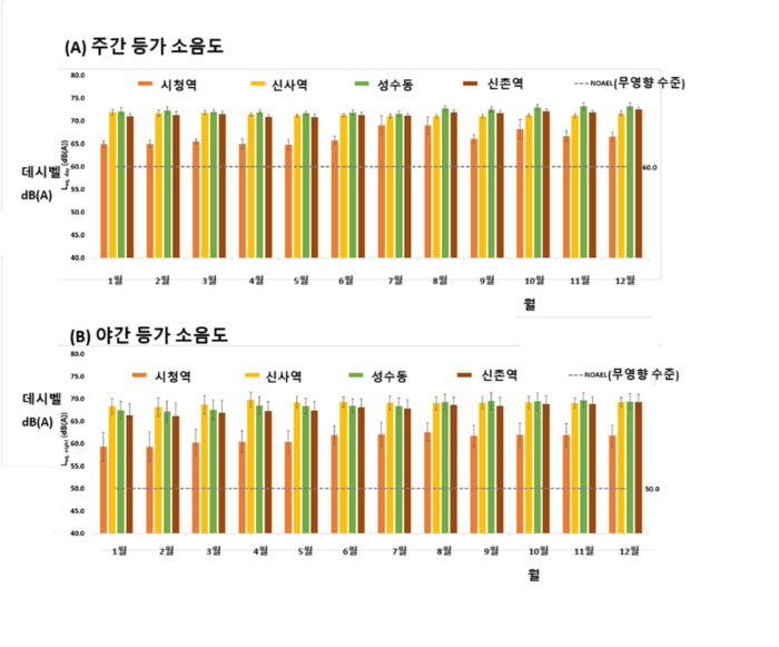 연구팀은 시청역과 신촌역, 신사역, 성수동 등 4곳에서 지속적으로 소음도를 측정, WHO의 무(無)유해 영향 수준(NOAEL)과 비교했다. 국내 환경소음 기준치도 있지만, 시민 건강에 미치는 영향을 구체적으로 파악하기 위해 WHO 기준과 비교했다.