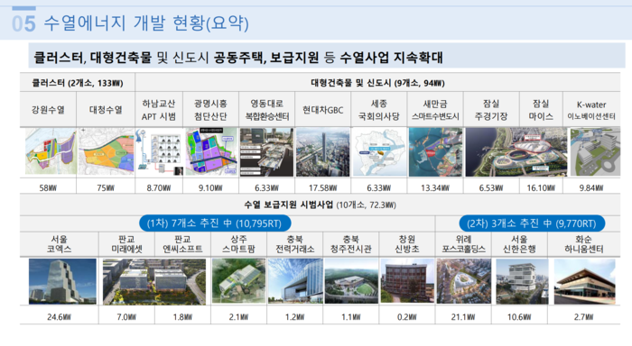 엑스, 현대 GBC, 세종 국회의사당 등 대형 건축물과 경기 하남 교산지구 공동주택 604세대에도 수열에너지 도입을 추진 중이다. 강원도 소양강댐 심층수를 활용한 '수열에너지 클러스터' 역시 본격 추진 중으로, 총 1만6000RT 규모 냉방을 공급할 계획이다. 소양강댐은 연평균 수온 7도를 유지해 강원 춘천은 수열에너지 최적지로 꼽힌다.