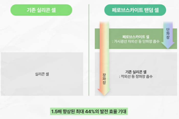 적외선과 같은 장파장의 빛을 흡수하는 실리콘 셀 위에 가시광선이나 자외선 등의 단파장 빛을 흡수하는 페로브스카이트를 적층시킨 구조의 셀이 바로 '페로브스카이트 탠덤 셀'이다.