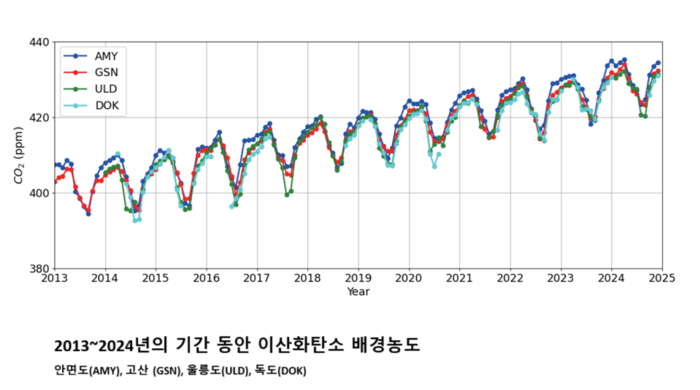 2024년 안면도와 울릉도, 제주(고산리) 기후관측소에서 측정된 이산화탄소 농도는 428~431ppm이었다. 이는 같은 해 전 지구 평균보다 5~8ppm 높다. 매년 약 3.4ppm씩 증가하는 추세를 고려하면, 산업화 이전 대비 2℃ 상승의 한계선인 450ppm까지 불과 6~7년밖에 남지 않았다.