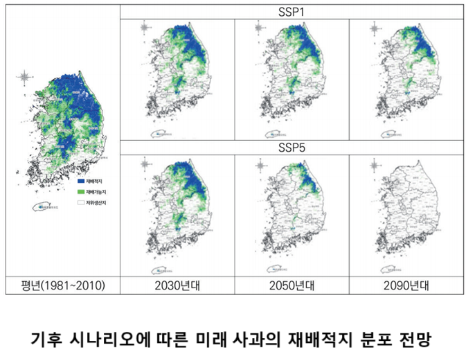 ▶농업: 벼의 출수 한계기가 늦어지고 보리의 유수형성기가 빨라지는 등 이상기상의 피해가 발견됐다. 채소와 과수의 수량성과 품질도 낮아지고 있다. 사과 재배지는 북상하거나 축소되고 있다. 사과 최대 산지인 충북 일부 지역은 앞으로 재배가 어려워질 수 있다. 밭작물의 생산성과 품질도 이상기상으로 감소세다. 열대거세미나방 등 외래 병해충도 확산 중이다.
