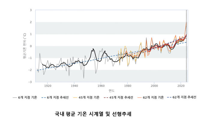 기온 상승은 기후위기의 가장 직관적인 지표다. 1912년부터 2024년까지, 우리나라 지표 기온은 10년마다 0.21℃씩 상승했다. 이는 같은 기간 전 세계 평균(0.15℃/10년)보다 40% 이상 빠른 속도다.