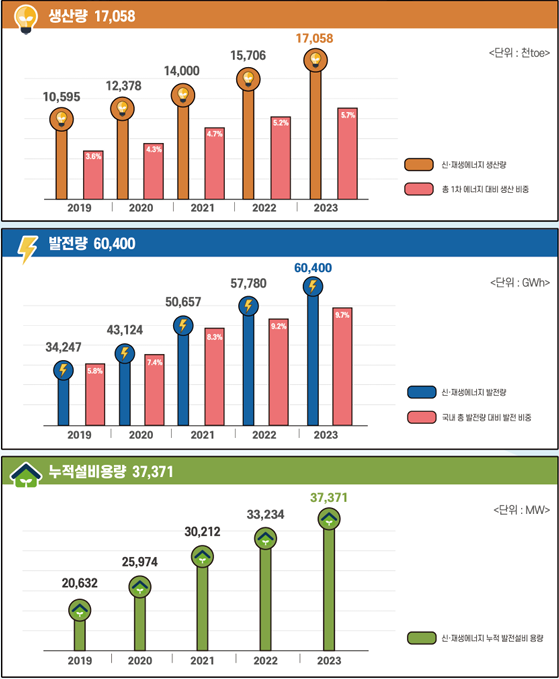 한국에너지공단에 따르면 신·재생에너지 발전 설비는 2019년 20.6기가와트(GW)에서 2023년 37.3GW로 4년간 81.1%나 증가했다. 이 증가율은 앞으로 더 가팔라질 것으로 보인다. 신재생에너지 발전량도 2019년 5.8%에서 2023년 9.7%, 2024년에는 11%까지 크게 늘었다.