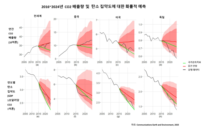 연구팀은 전 세계 157개 국가를 대상으로 2015~2024년 온실가스 배출 데이터를 분석한 결과, 전 세계 탄소집약도는 연평균 3.1% 감소한 것으로 나타났다. 탄소 집약도는 국내총생산(GDP) 단위당 이산화탄소 배출량을 말한다. 연평균 3.1% 감소는 파리 기후협정 이전(1960~2015년)보다 세 배 가까운 속도다.