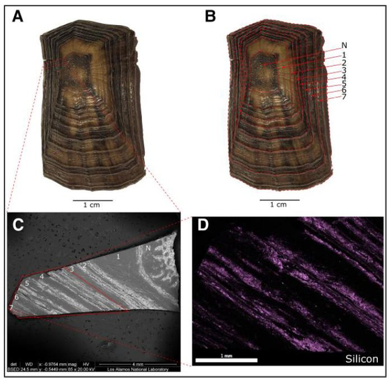 거북의 등딱지 역시 오염의 역사를 기록한다. 등딱지는 케라틴으로 이루어진 층이 해마다 덧붙으며 '나이테' 같은 성장 고리를 만든다. 각 고리를 분석하면 그 시기의 오염 상태를 연대별로 복원할 수 있다.