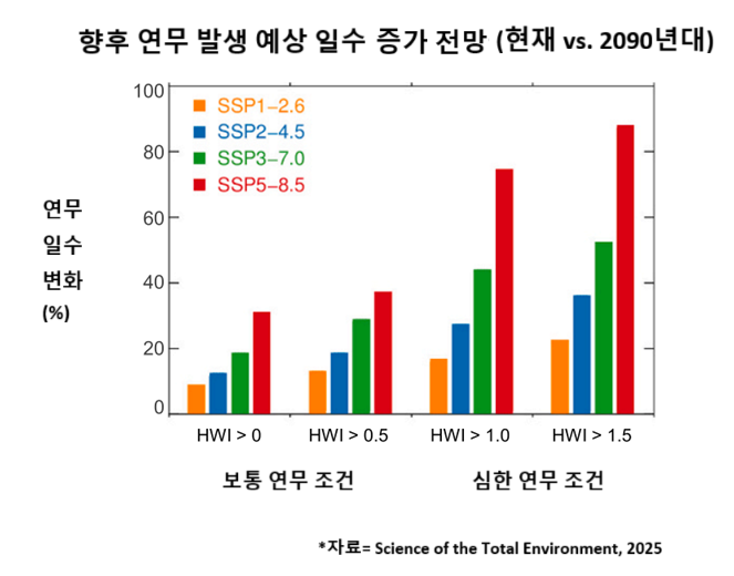 HWI가 0보다 커 연무 발생에 유리한 기상을 보이는 날은 과거 45.5일에서 2090년대에는 55.5일로 21% 늘어날 것으로 예측됐다. HWI가 0.5보다 큰 '보통 연무'일은 29.3일에서 39.7일로 35%가 증가할 것으로 전망됐다.
