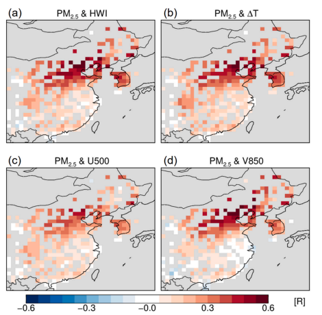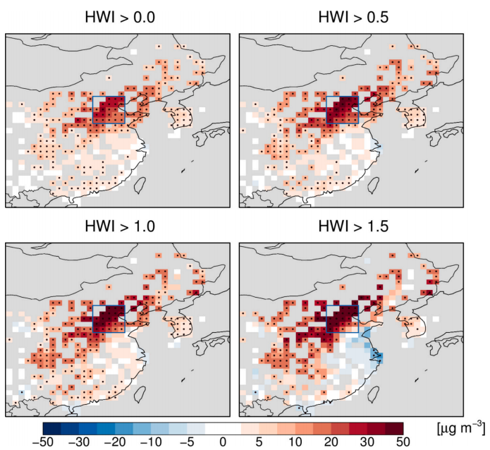 연구팀은 이 HWI와 관측된 일일 PM2.5 농도와의 관계를 조사했다. HWI는 특히 북부 동아시아 지역(동중국 및 한국)에서 일일 초미세먼지(PM2.5) 수준과 강한 양의 상관관계를 보였다.