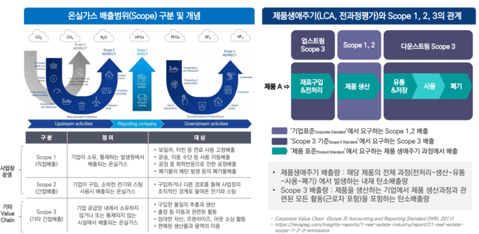 GHG 프로토콜은 배출 범위를 스코프 1(기업이 사업장 내에서 발생한 직접 배출량), 스코프 2(전력 등 외부에서 가져온 에너지로 인한 간접 배출량), 스코프 3(원료·부품의 매입이나 제품의 배송 등 가치사슬(공급망)을 통해 간접적으로 발생한 배출량)으로 구분한다.