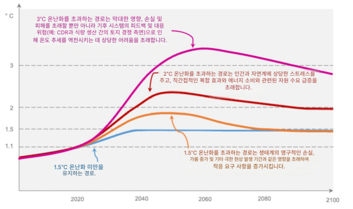 특히, 온난화 목표치를 일시적으로 초과한다면 온도가 다시 목표치 아래로 내려온다 하더라도, 그 기간 동안 발생한 많은 영향은 돌이킬 수 없다는 것이다.