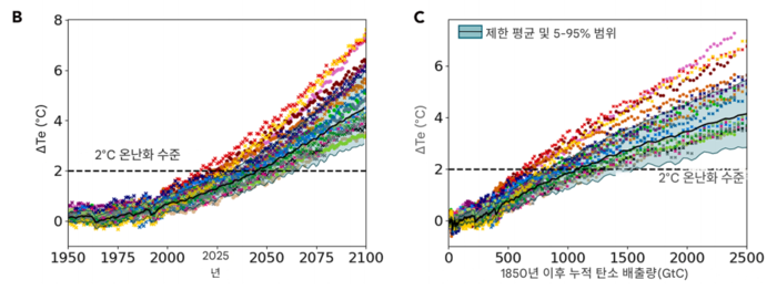 최근 일본 국립환경연구소(NIES) 지구시스템부 연구팀이 '원 어스(One Earth)'에 발표한 논문에 따르면, 2020년을 기준으로 2℃ 온난화 제한을 위해 남아있던 탄소 예산의 평균 추정치는 458.9 GtC(4589억 탄소톤)였다. 이는 종전 추정치(352.2 GtC)보다 늘어난 것인데, 전망치의 불확실성도 줄어들었다.