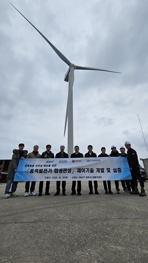 전력거래소는 16일 전남 영광에 위치한 전남테크노파크 발전소에서 유니슨 풍력발전기를 활용한 합성관성 기능 현장 실증시험을 시행했다. 이번 실증시험은 전력거래소, 광운대학교 산학협력단, 한국전기연구원(KERI), 유니슨으로 구성된 연구 컨소시엄이 수행 중인 '풍력발전기 합성관성 제어기술 개발' 관련 연구용역의 일환으로 진행됐다.