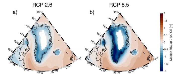 연구팀은 논문에서 그린란드의 해수면이 이번 세기 동안 전 세계적인 추세와는 반대로 1m에서 최대 4m가까이 낮아질 것으로 예측했다.
