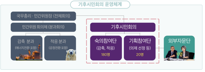 구성은 의제 선정과 논의 방식을 설계하는 기획참여단 20명과 실제 학습·토론을 수행하는 숙의참여단 180명으로 나뉜다. 숙의참여단은 온실가스 감축 분과 2개(각 60명)와 기후적응 분과 1개(60명) 등 총 3개 분과로 운영된다.