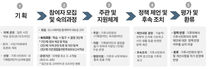 기후시민회의 운영은의 핵심은 시민 참여 중심의 상향식 의제 선정 구조다. 온·오프라인 플랫폼을 통해 국민 제안 의제를 수렴하고, 시민과 미래세대가 참여하는 토론회를 거쳐 기획참여단이 최종 의제를 선정한다. 이후 시민들은 학습과 토론을 통해 권고안을 도출하게 된다. 생활밀착형 정책 제안과 중·장기 기후정책 방향 제시가 주요 역할이다.