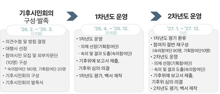 정부가 국민이 직접 탄소중립 정책 논의에 참여하는 국가 단위 상설 공론기구인 '기후시민회의'를 오는 4월부터 공식 운영한다. 대통령 직속 국가기후위기대응위원회(이하 기후위, 전 탄소중립녹색성장위원회)는 이르면 다음달 중에 기후시민회의 구성과 발족 절차를 마무리하고, 4월부터 1차년도 활동에 돌입할 계획이라고 28일 밝혔다.