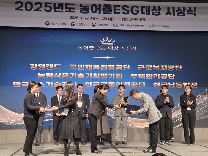 한국가스기술공사(사장직무대행 진수남)은 1월 22일(목) 부산 윈덤그랜드 호텔에서 개최된 농어촌상생협력기금 시상식 및 관계자 워크숍에서 2025년 농어촌상생협력기금 업무 추진에 대한 공로를 인정받아 농림축산식품부장관상을 수상했다고 밝혔다.