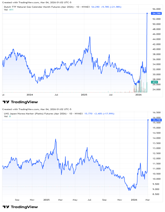 미-이란 사태로 천연가스 가격이 크게 오르긴 했지만, 러시아-우크라이나 전쟁 때의 폭등 수준에 비하면 양호한 편이다. 당시 JKM은 80달러, TTF 가격은 100달러까지 올랐었다.
