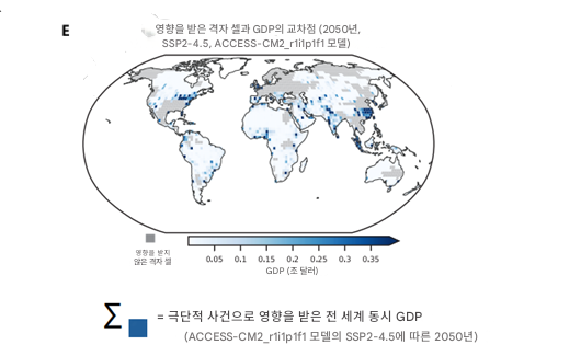 가장 현실적인 온실가스 배출 경로로 평가되는 시나리오(SSP2-4.5)를 기준으로, 21세기 중반(2041~2060년)에 추가로 위험에 노출되는 경제 규모는 ▶폭염: 약 93조 달러(전 세계 GDP의 약 37%) ▶토양 수분 가뭄: 약 20조 달러(GDP의 약 5%) ▶폭우·홍수: 약 16조 달러(GDP의 약 4.5%) ▶수자원 부족: 약 17조 달러(GDP의 약 3.7%) 등이다.