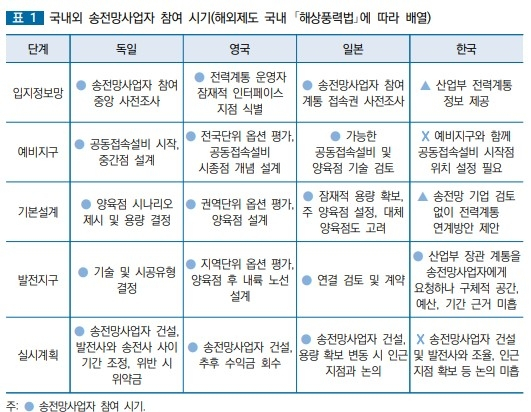 KEI 이재혁 연구위원 등이 작성한 이 연구보고서는 국내 제도의 핵심 문제로 송전망 사업자의 참여 시점이 해외 주요국에 비해 늦다는 점을 꼽았다.