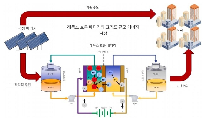 그렇다면 바나듐 흐름 배터리, 즉 바나듐 레독스 흐름 배터리(VRFB)는 어떤 특성을 갖고 있기에 재생에너지 확대에 따른 전력망의 안정성을 확보와 화재 위험 최소화라는 두 마리의 토끼를 잡을 수 있다는 것일까.