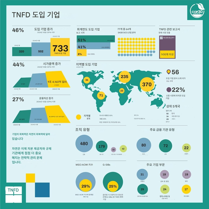 특히 이런 흐름 속에서 기업이 자연에 미치는 영향과 의존도를 공개하도록 권고하는 국제 협의체인 '자연 관련 재무정보 공개 협의체 (Taskforce on Nature-related Financial Disclosures, TNFD)'도 등장했다. TNFD는 기업이 자연에 미치는 영향과 의존성, 위험과 기회를 공개하도록 권고하는 국제적 프레임워크로, 기후 분야의 TCFD와 유사한 역할을 한다.