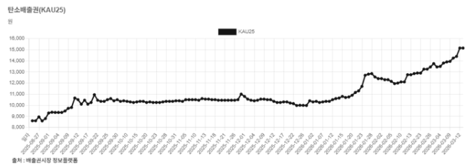 13일 배출권 시장에 따르면 KAU25 종가는 지난해 8월 25일 8600원에서 같은해 12월 30일 1만300원으로 상승했다. 이후 올해 이달 13일에는 1만5150원까지 오르며 7개월 여만에 약 76% 상승세를 보였다.
