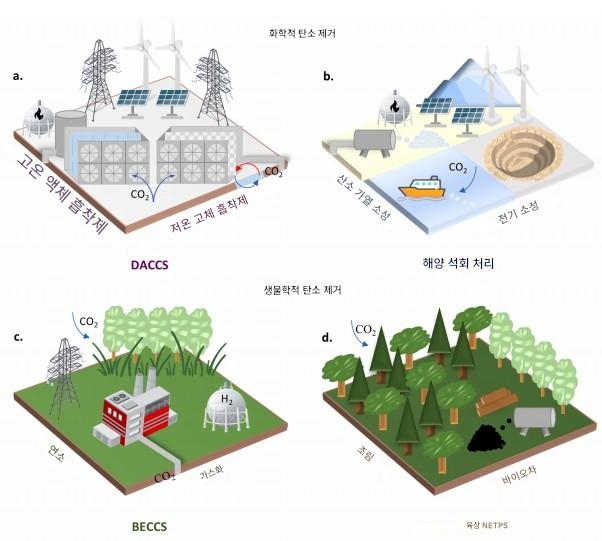 직접공기포집(DACCS)과 같은 화학적 제거 기술은 대규모 인프라 구축을 위해 니켈(Ni)과 바륨(Ba) 같은 핵심 광물의 수요를 폭발적으로 증가시켜 자원 공급망에 무리를 줄 수 있다. 또한 생물학적 제거 기술(BECCS)이나 바이오차(Biochar)의 경우, 대규모 경작에 필요한 칼륨(K) 등의 비료 자원 수요를 최대 70%까지 높여 식량 안보를 위협할 수 있다고 분석했다.