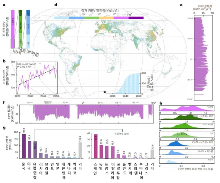 연구팀은 위성 기반 건물 데이터와 3차원 시뮬레이션을 결합해 전 세계 FIPV 잠재력을 분석했다. 그 결과, 현재 기술 조건에서 FIPV는 연간 약 732.5TWh(테라와트시, 1TWh=10억 kWh)의 전력을 생산할 수 있는 것으로 나타났다. 한 달에 300kWh의 전력을 사용하는 가구를 기준으로, 2억 가구 이상이 연간 사용할 수 있는 전력이다.