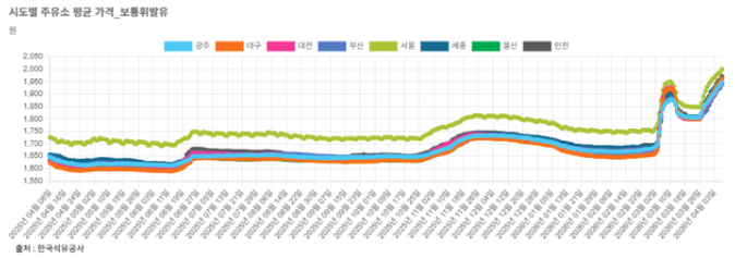 지역별로는 제주가 2019.2원으로 전국 최고가를 기록했고, 서울(2000.3원), 대구(1949원), 광주(1948원), 세종(1946원) 등이 뒤를 이었다. 주요 지역 가격이 모두 1900원 후반대에 진입하면서 전국 평균 역시 2000원 돌파를 앞둔 상황이다.